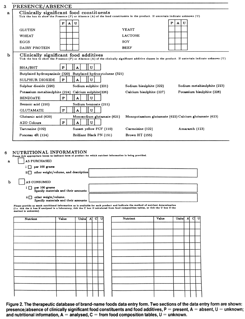 Figure 2. The therapeutic database of brand-name foods data entry form. Two sections of the data entry form are shown: presence/absence of clinically significant food constituents and food additives, P = present, A = absent, U = unknown; and nutritional information, A = analysed, C = from food composition tables, U = unknown.