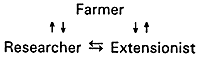In this approach technological packages are produced which are often inappropriate to farmers' circumstances. This is because, as they are designed mostly through experimental station research work, their domains of extrapolation have not been delimited. Farmers and on-station researchers are working in fundamentally different situations (Table 240). Therefore, it is important that farmers, researchers and extensionists establish a relationship which is the opposite of the linear, unidimensional and one-way model mentioned above, i.e.: