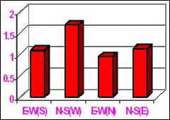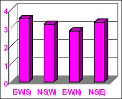 The average relative grain yield of groundnut (Fig. 1) and wheat (Fig. 2) was 93.3% when planted on the western side, with trees planted in a north-south direction. The relative grain yield of crops raised on the southern side with the trees planted in an east-west direction was 109.2%. The lowest yield was obtained from the groundnut and wheat planted on the northern side with the trees planted in an east-west direction. On average, trees grew best when planted in an east-west direction with the crops grown on the northern side.