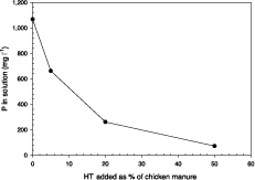 To demonstrate the capacity of HT to stabilize this soluble phosphate, increasing amounts of chloride-HT, viz. 0, 0.2, 0.8, and 2.0 g were added to 4 g aliquots of dried chicken manure, and the resultant mixes shaken with 10 ml of distilled water for 18 hours. As evident in Figure 6, the HT was able to greatly reduce P concentration in the extracts, soluble P being converted to an exchangeable form that would be suitable as a slow-release fertilizer.