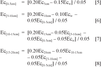 Conductivity estimates using equations from 1 to 8 are presented in Figure 3. Near the surface conductivity values of the soil were found to be in a narrow range [0.5-0.8 dS m-1]. Profiles L14-NS and L25-NS showed slight increases in conductivity with depth in the ploughed layer reaching 1 dS m-1. On the contrary, both profiles located in the saline patch (L25S and L14S) showed a strong increase in conductivity with depth since the conductivity of the 0.05-0.1 m layer reached values higher than 1.7 dS m-1.