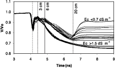 Figure 1. Measurements of the reflection coefficients of TDR traces with the waveguide immersed in solutions of in contrast to Nadler (1991), Kc was founded to be higher for low values of conductivity (Ecs <1 dS m-1 ) and lower for high values of Ecs (Ecs >3 dS m-1 ). Between 1 and 3 dS m-1, Kc was found comparable with the values indicated by the authors [Kc = 30-45]