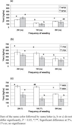 When no fertilizer was applied, weeding twice (NF2W) resulted in a better yield than with one (NF1W) or no weeding (NF0W) (Figure 2-a). The yield for second year at NF2W was improved as the weeding was carried out just after the rain and harvest index increased from 0.19 to 0.31. In contrast, the first year of IF and IM treatments resulted in better yields at each frequency of weeding than was obtained from NF2W. It is notable that in the first year, the treatments receiving only one weeding in both the IF and IM management systems yielded as high as those receiving two. However, by the second year, the yield of IF and IM decreased and the yields were only as high as that obtained from NW2W in the second year. There were significant differences in yield between the first and second year in the IM2W and IM1W treatments and these treatments yielded considerably higher than the corresponding IF treatments. However, by the second year the yields for the IM treatments were similar to the IF treatments, indicating that the livestock excrements was only effective for the first year. Overall, the mean harvest index of IM was better at each weeding frequency than that for IF and NF suggesting that the application of livestock excrements can enhance seed production of millet.