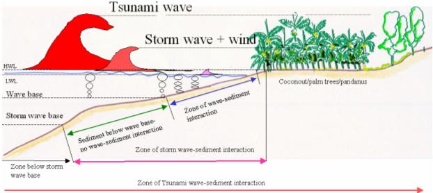 This type of coast consists of unconsolidated material, mainly sand, some pebbles and shells; it can be classified as a soft coast. It has a gentle seaward slope — known as dissipative beaches that have broad fine sand and gradually steep slopes at the backshore/foredunes. Its profile depends on wave form and energy and wind direction; hence, profiles can be adjusted to provide the most efficient means of dissipating incoming wave energy. This type of coast experiences short-term fluctuation or cyclic erosion — accretion and long-term assessment is needed to identify erosion as a problem here. Often accretion and dune rebuilding take much longer than erosional events and the beach has insufficient time to rebuild before the next erosive event occurs. Erosional features are a lowered beach face slope and the absence of a nearshore bar, berm and erosional scarps along the foredune. Generally, erosion is a problem when the sand dunes completely lose their vegetation cover that traps wind-borne sediment during rebuilding, improves slope stability and consolidates the sand. During extreme events such as storms and tsunamis (Figure 4.6), this type of coast can act as a barrier for the area behind the dunes. Sand dunes and their vegetation cover are the best natural protective measures against coastal flooding and tsunami inundation.