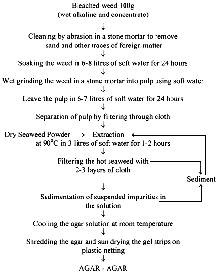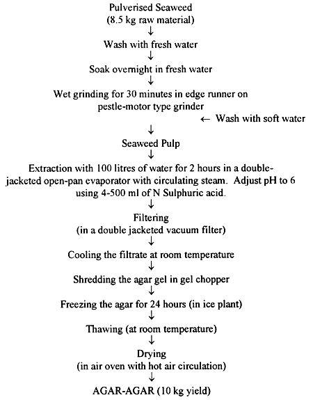 During and after the Second World War, attempts were made to extract agar from Indian seaweeds and different techniques were used to purify the agar gel. Bose et al. (1943) leached the whole weed for 18 hours before extraction and the gel was maintained at 60°C to remove suspended impurities. Starch present in the gel was removed by treating with 0.2% acetic acid for 1 hour and then washing the gel in water. Karunakar et al. (1948) employed a bacterial method for gel purification. Chakraborthy (1945) used freezing techniques to remove the suspended material. Mahonty (1956) found that heating under pressure at 230 °F was necessary for the removal of impurities in the gel of G. verrucosa. Thivy (1952;1960), made detailed investigations on extraction of agar from different species of Gracilaria and Gelidiella acerosa and on physical properties of the agar obtained from them. A cottage industry method for the manufacture of pure agar form Gracilaria edulis (=G. lichenoides) was developed in Central Marine Fisheries Research Institute (Thivy 1960). In this method, the impurities are removed from the seaweed before extraction. The leaching process minimised the cost of production and the yield from pulverised weed was also higher than that obtained by the earlier methods. Details of this method is given in Appendix 1. Kappanna and Visweswara Rao (1963) suggested that the quality of agar could be unproved by freezing and thawing. In pilot plant trials, Visweswara Rao et al. (1965) soaked the pulverised weed overnight in fresh water before wet grinding and extracting the agar. Details of this method is given in Appendix 2. To eliminate the cost of freezing, Desai (1967) suggested using 90% industrial alcohol for the flocculation of agar from filtrate.