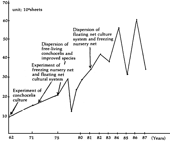 Laminaria is the most important economic seaweed in China. Mariculture of Laminaria on artificial floating rafts started in 1952 and the production increased steadily until 1980 when the highest yield of 252 907 tons of the dry product was produced. In recent years, the cultivation area and total yield of Laminaria declined because the culture of shellfish developed so quickly that the farmers prefer cultivating shellfish to Laminaria. Annual yield of Laminaria keeps over 200 000 tons.
