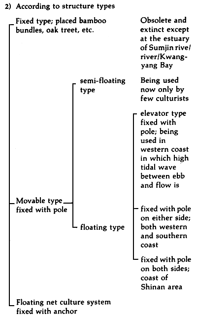 There are two basic floating raft kelp cultivation methods. One is hanging kelp rope (also called single-raft) cultivation method. Another is horizontal kelp rope (also called double-raft) cultivation method. The floating-raft, floating line is about 60 m long floated at the surface by buoys generally made of glass or plastics and anchored terminally by anchoring lines to wooden pegs driven into the sea bottom. Each kelp rope has about 30 kelps twisted in it and is about 2 m in length. In the single-raft method, the kelp ropes are hung down from floating line and weighted down by a small piece of stone. In the double-raft method, the end of two kelp ropes are linked or tied together, the other ends are tied to floating lines, respectively. The hanging kelp rope method has the advantage of better water movement but has the defect of uneven growth of the kelps. The horizontal kelp rope method has the benefit of more even growth of the kelp. However, it has the defect of being more resistant to water motion. Generally speaking, the single-raft method is better adapted to comparatively clearer water regions and the double-raft method to turbid regions with lower water transparency such as the Zhejing coast.