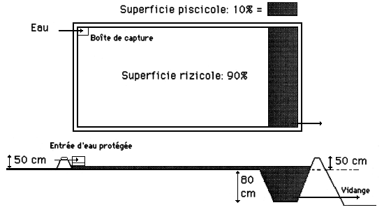 • Les recherches programmées (pour le futur) en matière de rizipisciculture en aval de la retenue doivent tenir compte de la présence (dans la retenue) de T. zillii (espèce phytophage susceptible de causer des dégâts considérables sur les jeunes plants de riz). Dans cette optique, nous recommandons de démarrer prudemment ce programme par des essais (très localisés et isolés des autres parcelles rizicoles) d'évaluation des dégâts occasionnés par ces poissons indési rables mais définitivement présents dans la retenue et en amont de celle-ci. Un schéma d'aménagement de parcelle rizipiscicole est figuré ci-dessous.