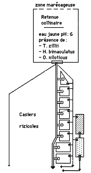 - Caractéristiques des sites: 7 retenues rizicoles complémentaires sur les 46 mises en place par la SOGUIPAH ont été visitées par la mission. Toutes les retenues ont en commun d'être alimentées en eau par un courant continu 9 mois sur 12 (système ouvert), d'être équipées d'un déversoir central de crue et d'être envahies par des espèces piscicoles locales dont T. zillii (espèce phytophage susceptible de brouter le riz) et H. bimaculatus (prédateur d'oeufs et d'alevins ).