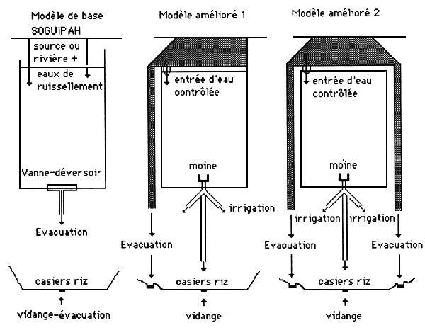 Ces modifications dans la conception de l'aménagement des retenues rizicoles permettraient de transformer les retenues d'eau en véritables étangs entièrement maîtrisables et par conséquent, beaucoup plus productifs (jusqu'à 5–8 tonnes/ha/an au lieu de 2 t/ha/an maximum pour les retenues non maîtrisables). La faisabilité des travaux dépendra du profil en travers des vallées concernées et de la disponibilité des bulldozers pour la construction des canaux d'évacuation latéraux. De petits étangs de 4 ares peuvent être aménagés en amont des casiers rizicoles.