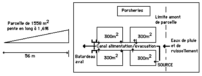- Observations: le site se prête bien à la mise en place d'un élevage associé porcs-poissons (maximum 250 porcs) ou volailles-poissons (maximum 2500 poules); si le propriétaire souhaite investir dans cette voie, les bâtiments d'élevage devraient être construits sur la presqu'île pour faciliter l'écoulement des déjections dans la retenue.