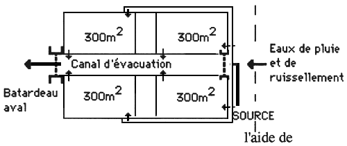 • Le test d'aménagement du batardeau amont étant positif, il convient de modifier définitivement le plan d'alimentation en eau des étangs par la construction d'un petit déversoir amont en dur, réglable en hauteur par planchettes en bois, et d'assurer ainsi l'alimentation en eau de chaque étang (individuellement), par les canaux latéraux selon le plan indiqué sur le schéma.
