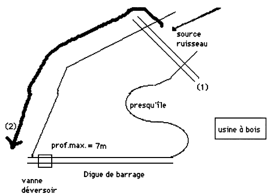 - Recommandations: si le propriétaire envisage l'exploitation de sa retenue en élevages associés (après une sérieuse étude de marché), il serait bon de vidanger la retenue et d'examiner la possibilité de construire un petit barrage amont (1) et un déversoir latéral d'évacuation des eaux excédentaires (2), puis de niveller en pente douce (vers le dispositif de vidange) la pente de l'étang ainsi aménagé pour une meilleure maîtrise des conditions de production piscicole.