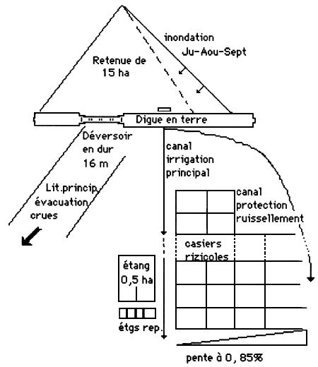 - Caractéristiques du site: barrage - retenue collinaire permanente de 4,5 ha pourvue d'un déversoir et d'un dispositif de vidange (vanne), destinée à l'irrigation de parcelles rizicoles en aval.