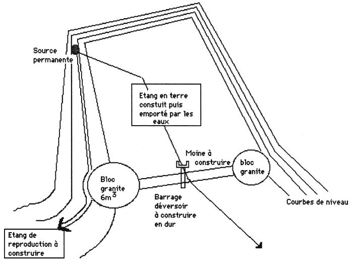 Cet aménagement pourrait être complété par un canal d'alimentation sur la courbe de niveau de la source la plus haute vers un petit étang de reproduction en dérivation à construire à mipente, au-dessus de la zone inondable, et en aval de l'étang de barrage.