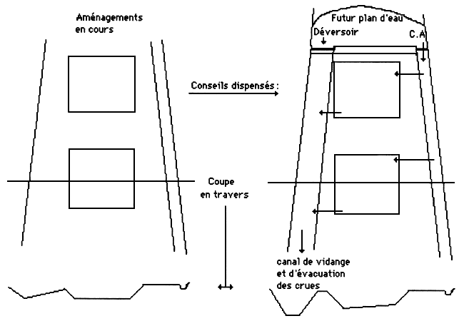 - Observations: sans encadrement, les candidats pisciculteurs n'avaient prévu ni barrage régulateur de plan d'eau avec déversoir, ni canal d'évacuation et deprotection des crues, ni pente régulière de l'assiette de l'étang vers le point de vidange.