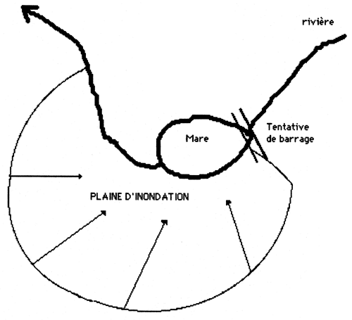 • Avant de commencer à travailler la digue de barrage-capture, il faut modifier le tracé de la rivière suivant la topographie favorable du site (voir schéma); pour ce faire, il suffit de creuser d'aval en amont un nouveau lit de saison sèche pour la rivière en court-circuitant la mare et en rejettant la terre du coté mare, pour ériger une digue le long du nouveau lit (cette digue contribuera à piéger le poisson en décrue).