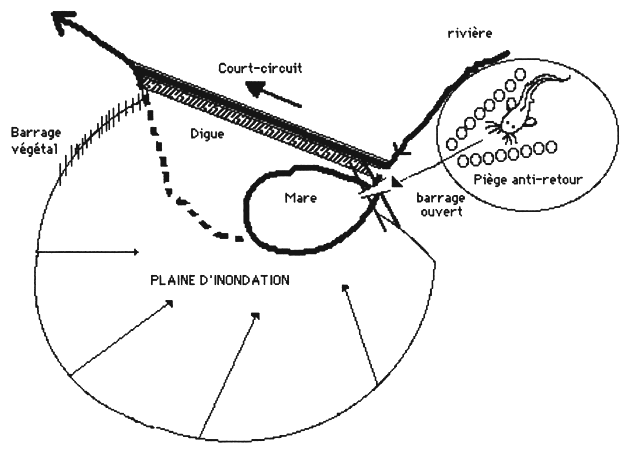 • Il reste à construire un barrage ouvert avec un dispositif anti-retour (piquets enfoncés en “nasse qui ne prend pas” dans le sol) pour permettre aux poissons d'entrer mais pas de sortir, puis de placer un barrage végétal en bordure de plaine d'inondation, là où le poisson pourrait s'échapper du piège.