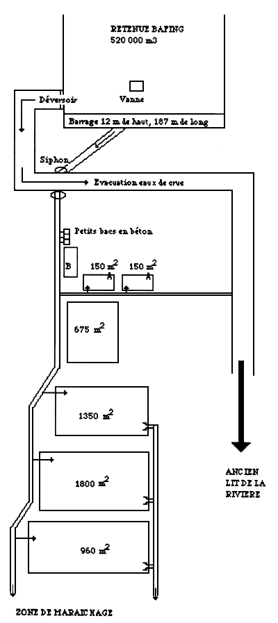 - Caractéristiques du site: station de pisciculture de 50, 85 ares aménagée en aval de la retenue du Bafing par 1' ODE-PAG sous financement BAD-Arabie Saoudite. Alimentation en eau par prélèvement de l'eau profonde (la plus froide?) dans la retenue, puis par siphon sous le canal du déversoir, puis par canal d'alimentation latéral qui alimente les étangs en dérivation (voir schéma).