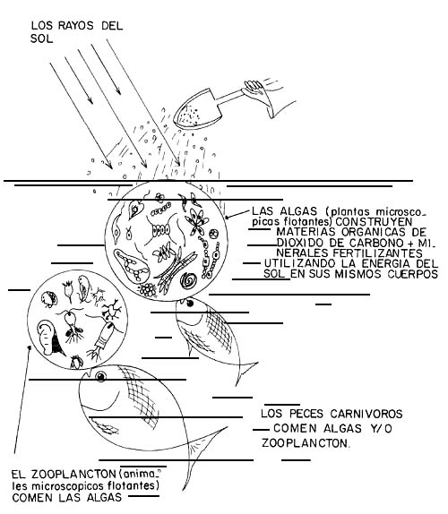 LAS ALGAS PEQUEÑAS SON LAS PRODUCTORAS PRIMARIAS PRINCIPALES, QUE CONSTRUYEN POR MEDIO DE LA FOTOSINTESIS LAS SUBSTANCIAS ORGANICAS, QUE AL SER COMIDAS POR LOS PECES, PAR. TE SE TRANSFORMA EN CARNE.