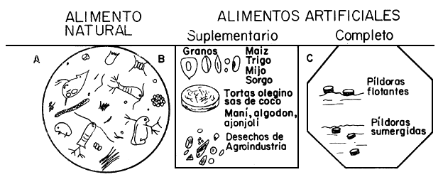 En un estanque de piscicultura, como en todo depósito natural de agua estancada, como los lagos, lagunas, etc., los “productores” más importantes son unas algas muy pequeñas que, por medio de la fotosíntesis y otros procesos biológicos, acumulan las materias orgánicas (proteínas, grasas, carbohidratos, vitaminas, etc.) que contiene la carne de pescado.