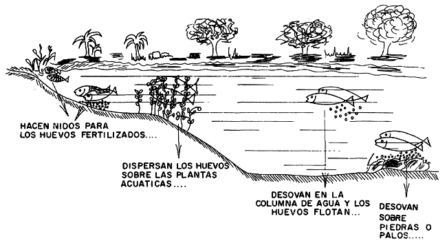 Se sabe que la mayoría de los peces de importancia económica desovan en los ríos durante la época de las lluvias. Los huevos son llevados por los ríos corriente abajo.