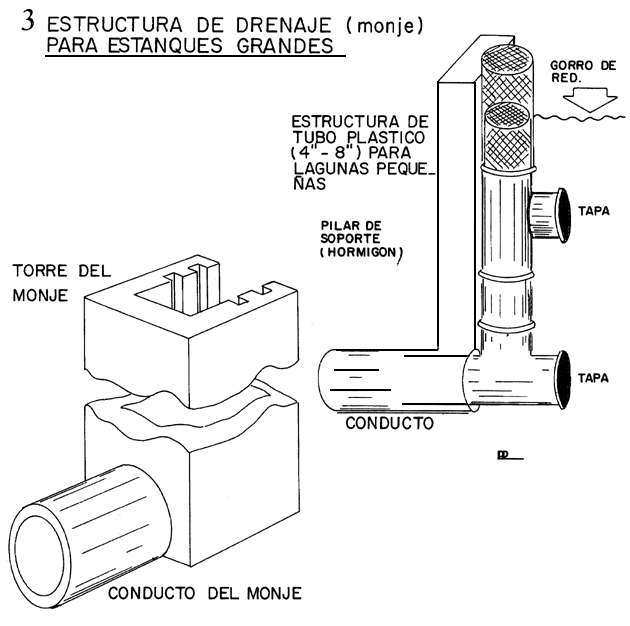 Hasta los estanques de una hectárea pueden drenarse mediante una estructura de drenaje construida con tubos plásticos de 4, 6 u 8 pulgadas, usando las combinaciones de “T”s y niples rectos. Las bocas de las “T”s se cierran con tapones, de suerte que no dejen pasar ni una gota de agua.