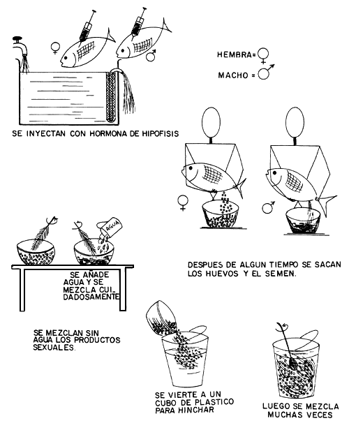 Algunas especies de peces comienzan a desovar después de 6 a 8 horas de haber sido inyectados. Otros tienen que ser presionados - en la región abdominal para que expulsen los productos sexuales. Estos productos se mezclan y luego se añade agua.