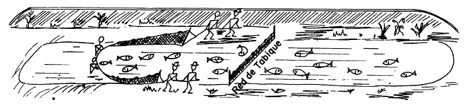 Aquí se ofrece un esquema para una granja piscícola en los LLanos. La zanja trae el agua al centro de la granja y el drenaje,-así como la cosecha, se realizan mediante un estanque de cosecha contiguo que tiene un metro mas de profundidad y se ha excavado a nivel del fondo de los estanques de producción.