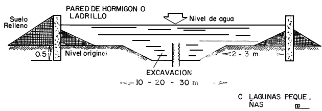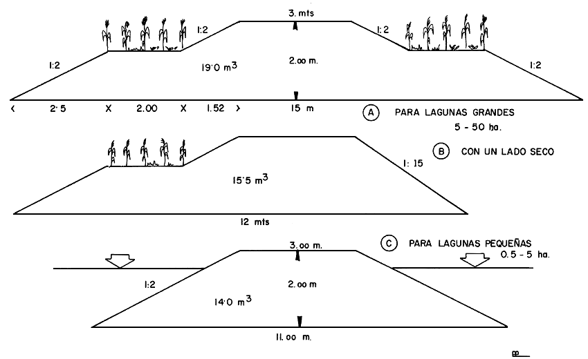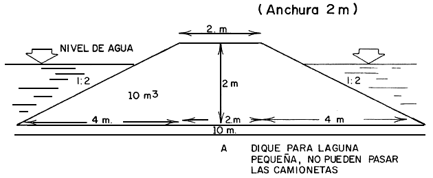 Un pequeño estanque de no más de una hectárea de extensión no necesita represas de 3 o 4 metros de ancho, a menos que también se utilicen para el tránsito de vehículos.