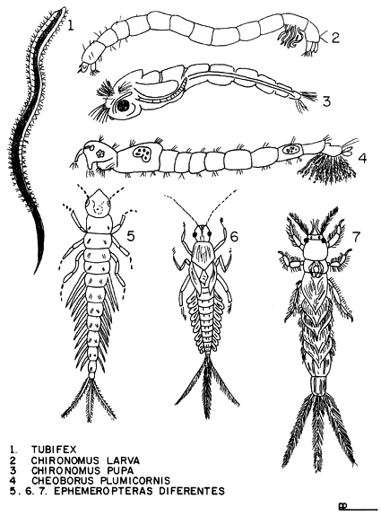 Hay otros insectos y larvas de insectos que viven en las-partes sumergidas de las plantas acuáticas; muchos de estos son carnívoros y pueden hacer daño a los peces muy jóvenes. En cambio los peces mas grandes se comen esos insectos, larvas, etc.