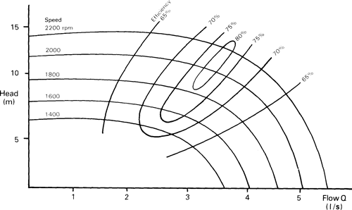 Fig. 16 Typical curves showing relationship between head, flow, speed and efficiency (example given for a centrifugal pump)