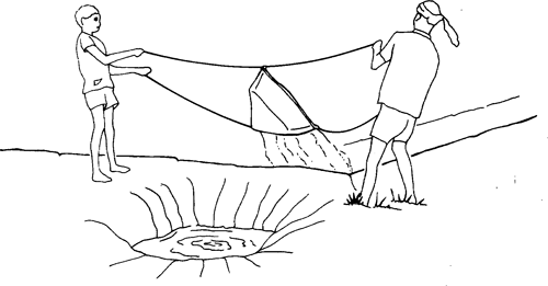 These are all variations on the theme of the bucket, are hand-held and must be the earliest artificial methods for lifting and carrying water. The watering can is effectively a bucket with a built-in sprinkler and represents an efficient, but labour intensive method for irrigating very small land-holdings. Artisan-made watering cans are quite widely used in Thailand. Scoops, bailers (Fig. 17) and the swing-basket (Fig. 18) represent methods of speeding up the process of filling, lifting and emptying a bucket; the latter also uses two people rather than one and thereby increases the mass of water that can be scooped in each swing. These are more fully described in Section 4.2 in the context of using human muscle power, since they have evolved in such a way as to fit the human prime-mover but to be unsuitable for any kind of mechanization. They are rather inefficient as water is lifted over lm and allowed to fall back to 0.3-0.5m, which is the approximate operating head for devices of this kind.
