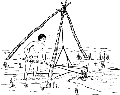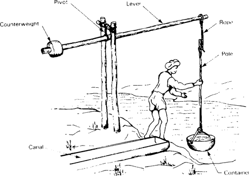 The next: stage of technical advance is to support the mass of water being lifted by mounting the scoop or bucket on a suspended pivoted lever to produce a swinging scoop (Fig. 19) or a see-sawing gutter or "dhone" (Fig. 20) which also operate through low lifts (0.5-lir.) at relatively high speed. The water container can be balanced with a weight; Fig. 21 shows a counterpoise lift, alias water-crane or "shadoof".