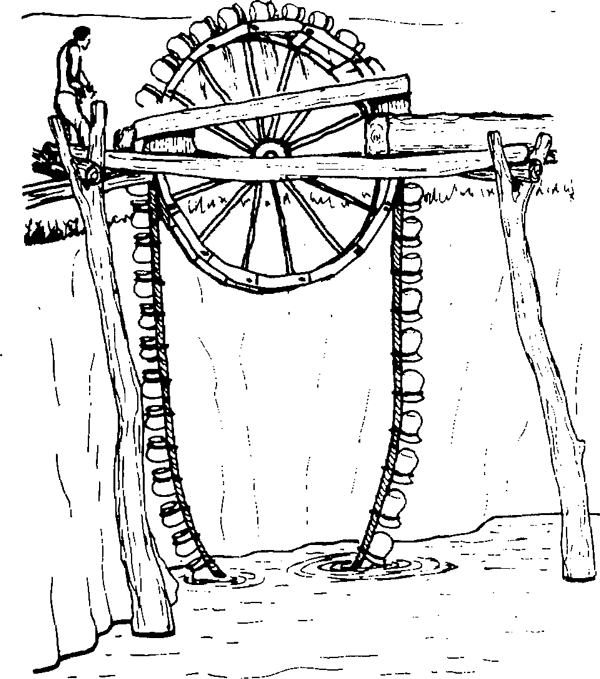 An. obvious improvement to the simple rope and bucket is to fit numerous small buckets around the periphery of an endless belt to form a continuous bucket elevator. The original version of this, which is ancient in origin but still widely used, was known as a "Persian wheel" (Figs. 23, 94 and 95); the earliest forms consisted of earthenware pots roped in a chain which is hung over a drive wheel. The water powered "noria" (Figs. 24, 151 and 152), a water wheel with pots, buckets or hollow bamboo containers set around its rim, is similar in principle except the containers are physically attached to the drive wheel circumference rather than to an endless belt suspended from it.