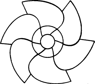 Various different spiral shapes have evolved for the internal baffle plates in the sakia, and the Hydraulic Research and Experimental Station (HRES) in Egypt tested various models to try to determine the optimum design. The best shaped designs, such as in Fig. 27, were measured as being as much as 50% better than the worst. Since some 300 000 sakias are in use in the Nile valley and Delta, optimization of the design could yield substantial aggregated benefits. An important feature of the the three most successful sakia variants tested is that the outer compartments divided by the internal baffle plates discharge first into individual collection chambers which in turn discharge through holes surrounding the hub instead of having a common discharge orifice as on the more traditional designs. This prevents water running back into the compartment adjacent to it.