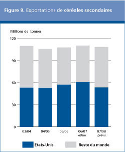 Selon les prévisions, le commerce international de céréales secondaires en 2007/2008 (juillet/juin) s'élèverait au total à 108 millions de tonnes, en baisse de 2 millions de tonnes par rapport à la campagne précédente. L'essentiel de cette réduction devrait être imputable à l'Asie, principalement du fait de la réduction attendue des importations de maïs. Les échanges de maïs atteindraient au total 82 millions de tonnes, soit une baisse de près de 3 millions de tonnes par rapport à 2006/2007. Toutefois, le recul des échanges de maïs serait en partie compensé par une augmentation du commerce de l'orge, que les prévisions établissent à 17 millions de tonnes, soit un million de tonnes de plus qu'en 2006/2007. Les échanges de sorgho devraient légèrement diminuer, passant à 5,5 millions de tonnes.