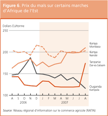 Du fait de la bonne situation des disponibilités de maïs au Kenya, en Ouganda et en Tanzanie, les prix de cette céréale sont restés stables pratiquement tout au long de l'année (Figure 6). Selon le Conseil des céréales de l'Afrique de l'Est (EAGC), les trois pays disposent d'excédents commercialisables de maïs. Toutefois, les données émanant du Regional Trade Intelligence Network (RATIN) montrent que les prix de gros du maïs en Tanzanie ont en moyenne fortement grimpé en août et septembre, passant à plus de 170 dollars EU la tonne, après être restés assez stables pratiquement toute l'année (à savoir 120 dollars EU la tonne). Ces chiffres sont à rapprocher de ceux constatés à la même époque en 2006 et 2005, à savoir respectivement 143 dollars EU la tonne et 146 dollars EU la tonne. En Éthiopie, les prix des céréales au cours de ces deux dernières années sont restés largement supérieurs à ceux des années précédentes, en dépit de trois bonnes récoltes consécutives. Depuis janvier 2004, ils n'ont cessé d'augmenter, ne retombant que légèrement après la récolte Meher de 2004. Ils ont atteint des niveaux record en octobre 2006 et les dernières observations (enquête commerciale rapide) montrent que la tendance à la hausse s'est poursuivie (Figure 7). Contrairement aux tendances historiques, il n’y a pas eu réduction notable des prix après les récoltes au cours des dernières années. Selon les études récentes, les facteurs pouvant sous-tendre l'évolution actuelle des prix incluent: la croissance relativement rapide des revenus, alimentée par l'augmentation rapide des dépenses publiques, le crédit (commercial et le micro-crédit), les recettes d'exportation et les transferts sous la forme d'envois de fonds, les Programmes de filet de sécurité productif (PSNP); la rétention des stocks céréaliers par les petits agriculteurs en raison de l'augmentation des revenus en espèces à partir de sources alternatives et des prix élevés des produits agricoles (y compris les céréales); et la diminution de la quantité d'aide alimentaire distribuée dans le pays. L'inflation qui touche les produits alimentaires, estimée actuellement à environ 19 pour cent, est la plus forte depuis 2003. Les taux élevés constatés à la fin 2003 s'expliquaient par l'impact de la sécheresse de 2002. La situation de la sécurité alimentaire d'un grand nombre de personnes vulnérables, principalement dans les centres urbains, se ressent de cette hausse constante des prix.
