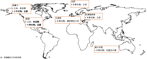 澳大利亚东部许多地区11月初的大范围降雨来得太迟了,无法改善冬季作物单产减少的预期,生长期的大多数时间都遭受干旱。由于收获已经开始,现在的降雨反而会带来更大灾害,威胁收成的质量。由于9、10月份整个关键生长期间持续的干旱天气和温度比往年偏高,10月底官方最新预测小麦产量降至1210万吨。虽然这一产量比2006年更为严重的减产水平高出约200万吨,但是却比该国常年产量减少近一半,这也是过去六年间第三个严重减产的年份,对该国的出口和库存产生重要影响(参见图7)。澳大利亚一般是世界上最大的粮食出口国之一。除小麦外,其它冬季作物(主要是大麦)同样也受到恶劣气候的影响,远低于预期的常年水平。然而,11月的降雨对于少量的夏粮作物(主要是玉米和高粱)可能有利,这些作物在9-12月份播种,至第二年3-6月收获。