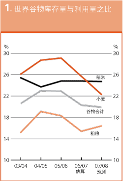 预测2007/08年度世界谷物季末库存量与下一年度世界谷物利用量趋势值之比将下降至19.2%,使过去五年的最低水平。利用量的猛增可能将吸收2007年世界谷物产量预期增长量的大部分,因此仍使世界季末库存量保持在很低的水平。预测小麦该比率将大幅下降至23.1%,大大低于本十年前半期出现的34%的水平。与本年度先前的预期相左,目前预计粗粮该比率将比去年原本已经很低的水平进一步下降,至仅15%。同样,在稻米方面,最新资料显示供求形势较先前预测还要紧张,目前预测库存量与利用量之比将降至23.5%,也是过去五年的最低水平,大大低于本十年前半期的平均水平。