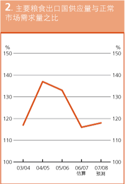 随着主要粮食出口国2007年收获工作现已完成,对其2007/08年度谷物供应总量与正常市场需求的比率的估算数字更为可靠,确认了盈余仅18%的先前预期,略微高于上年度但仍处于相对低的水平,因为本十年中期该比率为30%以上。这说明这些出口国满足全球小麦和粗粮进口需求的能力仅有小幅改观,意味着新年度市场紧张的态势很可能继续。