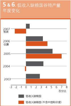 5&6鉴于低收入缺粮国最易受到其自身产量和供应量变化的影响,粮农组织的第五项指标衡量的是低收入缺粮国的产量变化情况。第六项指标反映的是不含中国和印度这两个最大生产国的其它所有低收入缺粮国的年度产量变化情况。