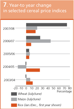 7 The seventh indicator demonstrates cereal price developments in world markets based on changes observed in selected price indices.