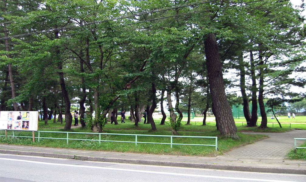 Coastal forest at Shizugawa Park (Miyagi Prefecture) on the Sanriku coast of Japan. Heavily populated, the coast is subject to frequent tsunamis. This forest is reported to have reduced damage from 1960 Chilean tsunami (Izumi 1961 in Harada and Imamura, 2003). Note the trunk deformations caused by storms and tsunamis. Such forests still serve additional uses, such as recreation