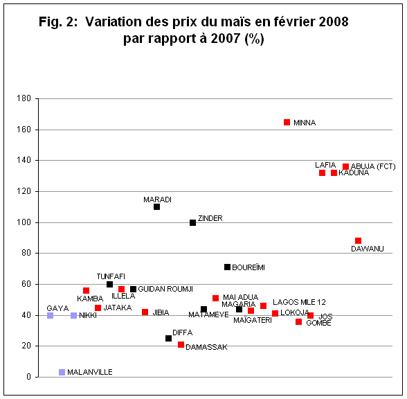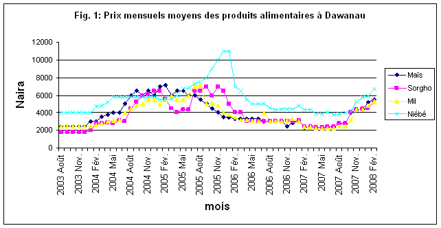 En 2007, année où la production a été bonne, les prix les plus bas ont été constatés dans le nord et le centre du Nigéria (Kaduna, Dawanau, Lafia, Minna, etc.), suivis du nord du Bénin et du sud du Niger, tandis que les marchés du sud et du centre-sud du Nigéria enregistraient les prix céréaliers les plus élevés. Cette situation reflète la structure normale des échanges, qui permet aux négociants d'envoyer des céréales du nord du Bénin au Niger et du centre et du nord du Nigéria vers le Niger et le sud du Nigéria, en fonction de l'offre et de la demande dans chaque zone.