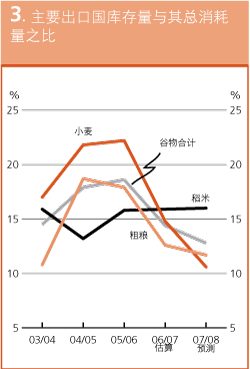 预测2007/08年度结束时主要出口国的季末谷物库存量与其总消耗量之比将陡降至12.8%。在小麦方面,该比率最低,仅为10.6%,这就是本年度市场价格高位波动的原因。在粗粮方面,预计该比率将比上年度进一步下滑,至11.7%。预计美国国内巨大的玉米用量,尤其是用于生产乙醇的用量,将吸收其2007年产量增幅的大部分。预计稻米的比率仍将维持在16%上下。
