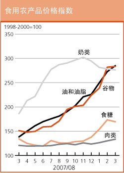 2008年第一季度粮农组织油/油脂指数达269点,比2007年同期点数高133点(即98%)。对植物油和油脂需求(食用需求和生物燃料原料需求)的不断增加,加之产量增幅放缓,导致全球供给逐步趋紧,从而引发了价格飙升。按年度计算,2007年该指数平均为174点,而2006年平均为117点。