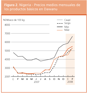 En los países costeros han comenzado los preparativos para la siembra de las cosechas de cereales de la temporada principal de 2008, mientras en el Sahel la siembra está prevista para junio. Los precios altos y crecientes que se registran en toda la subregión están teniendo repercusiones negativas en el poder adquisitivo de los consumidores y en su acceso a los alimentos. Ya desde el período de la última cosecha, en septiembre de 2007, se han ido observando aumentos significativos en los precios de los cereales en toda la subregión, lo que suscita graves preocupaciones sobre las perspectivas para la seguridad alimentaria. Sin embargo, el alcance del aumento de los precios ha variado de región a región y de país a país, debido a la diversidad de las fuerzas que lo impulsan. Según los resultados de la misión mixta1/ de evaluación de los mercados de alimentos que visitó los principales mercados de cereales en algunos países de África occidental entre mediados de febrero y mediados de mnarzo (véase el recuadro: Misión mixta de evaluación de mercados en Benin, el Níger y Nigeria), los aumentos mayores de los precios se produjeron en la parte oriental de la subregión, principalmente en el Níger y Nigeria. En el Mercado internacional de cereales de Dawanau, en Kano (Nigeria), el mayor de la subregión, el precio del sorgo, el cereal más comercializado en Nigeria, dio un salto desde 2750 NGN por saco en septiembre de 2007 a 5300 NGN por saco en febrero de 2008, un incremento de 92 por ciento en cinco meses. Durante el mismo período el precio del mijo aumentó un 116 por ciento, mientras que el precio del maíz en febrero de 2008 era un 96 por ciento más alto que en agosto de 2007. La misma tendencia se ha observado en todos los mercados analizados en Benin, el Níger y Nigeria. Para el maíz, por ejemplo, los aumentos de los precios en febrero de 2008 comparados con los del mismo período en 2007 oscilan entre 3 por ciento en Malanville (Benin septentrional) y 165 por ciento en Minna (Nigeria centro septentrional).