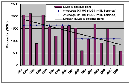 Agricultural policy: A strong negative trend in the national maize production, which accounts for the major part of food production, over the last 15 years is evident (see Figure 1). A more recent (since 2000) decline is partly due to the structural change precipitated by land tenure changes and partly due to the overriding economic deterioration and reduced profitability of maize production. The newly settled farmers cultivate only about 30 to 55 percent (CFSAM 2007) of the total arable land allocated to them owing to shortages of tractor/draught power, fuel, and investment in infrastructure/improvements and absenteeism on the part of some new settler beneficiaries. Following the land reform programme, the large-scale commercial sector now produces less than one-tenth of the maize that it produced in the 1990s. The reasons for the downward trend before the land reform include a gradual switch by the large-scale commercial farms from maize which became a GMB-controlled crop to other non-controlled crops such as tobacco, cotton, wheat and others. Some experts also argue that the environmental factors such as increased frequency of drought, combined with maize production being on more marginal lands of the communal farms, can explain some of the long-term negative trends.