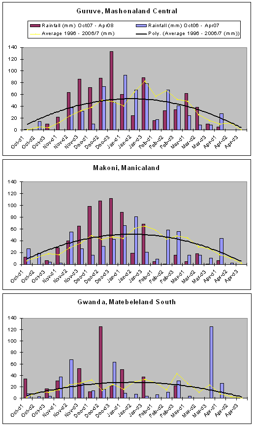 The dekadal estimated rainfall pattern for the 2007/08 season, in comparison with the previous year and the long-term average in selected districts from the north, central and south is shown in Figure 2.